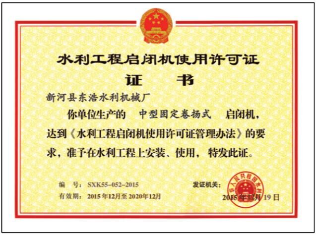 中型螺杆式启闭机许可证